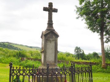 nagrobek kamienny - krzyż na cokole, kunsztownie wykonany, otoczony kutym płotkiem, dalej widoczny murek z kamieni polnych.
