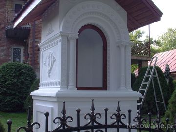no i jakże nie chwalić ! - przydomowa, odremontowana "ze znawstwem tematu" kapliczka z oszkloną niszą na postumencie, bogata dekoracyjna ornamentyka - pewnie uposażenie / figurka / rzeźba też będzie cenną / wyjątkową w prezentacji / uduchowieniu / przekazie...