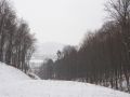 nowa utwardzona droga leśna prowadzi ze składu drewna przy leśniczówce w Dębnej i tu wybiega na przysiółku Machlina - w dole San płynie a za nim we mgle zbocze (Międzybrodzie)