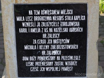 obelisk z tablicą - dla uczczenia miejsca poświęconego, to tu w XIX wieku była kaplica zdrojowa dla wyznawców obrządku rzymsko-katolickiego - dla tych co tu zamieszkiwali, w kurorcie pracowali a także a może w szczególności dla kuracjuszy uzdrowiska i wypoczywających w pensjonatach. Tam często też leczyli się i bywali wyznający inne religie,np. prawosławie, judaizm, ewangelicy.
