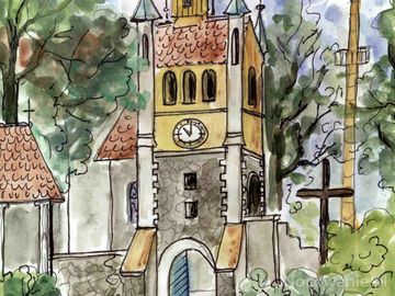 Obraz dzwonnicy namalowanej przez miejscową artystę Teresę Bańkowską-Jendras (Łagiewniki)