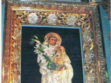 Obraz przedstawiający św. Antoniego z Padwy z Dzieciątkiem /które - prawą ręką łaskocze w stopę/ - w ołtarzu po prawej kościoła pw. Podwyższenia Krzyża Świętego. Naprawdę miał na imię Ferdynand i urodził się w Lizbonie w roku 1195. Zmarł 13.06.1231r. w wieku 36 lat na "puchlinę wodną", pochodził z bogatej rodziny arystokratów, nie chciał być prawnikiem, wstąpił do zakonu. Gromadził przy sobie tłumy wiernych, jego kult rozwijał się bardzo szybko, już w 1232r. papież Grzegorz IX ogłosił Go świętym. W czasie kanonizacji przedstawiono 53 cudów dokonanych za Jego wstawiennictwem. Dziś znany głównie jako patron rzeczy znalezionych, pomaga też w szukaniu kluczy, komórki ale też męża / żony, wzywany jest gdy zgubiła się gdzieś nasza wiara albo sens życia, czy coś równie ważnego !