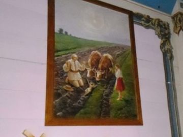 Obraz przedstawiający wyoranie krzyża namalowany przez Lisowskiego w 1926 roku. (Klimkówka)
