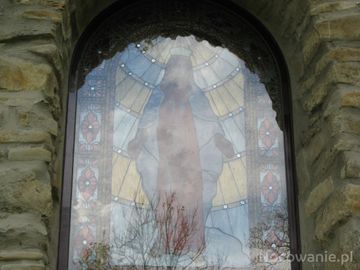okno zamknięte półkoliście, w nim witraż - współczesne.