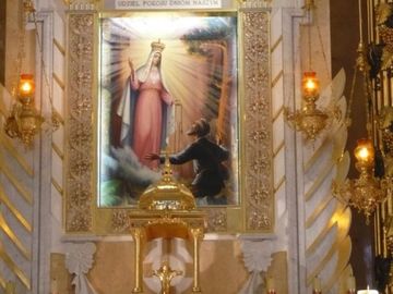 Ołtarz główny Bazyliki w nim umieszczono obraz Matki Bożej Licheńskiej ,przysłonięty jest obrazem:Matka Boża objawia się Mikołajowi Sikatce w lesie grąbliński (Licheń Stary)