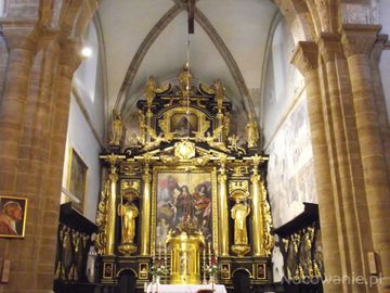 ołtarz główny bazyliki, wywodzącej swe formy jeszcze z antycznej, rzymskiej architektury. Wnętrze świątyni, o pięknej romańskiej strukturze, to trzynawowa bazylika o czterech przęsłach wyznaczonych przez potężne filary międzynawowe, z transeptem oraz prostokątnym prezbiterium. Całe wnętrze przekryte jest sklepieniem krzyżowo - żebrowym, o przęsłach oddzielonych gurtami.