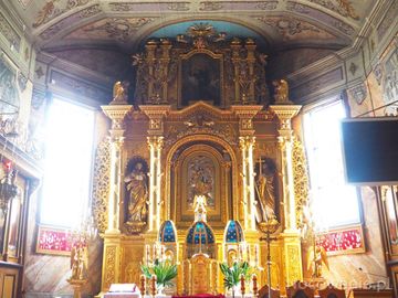 ołtarz główny i polichromia sklepień pokryta jest patyną czasu a szarawy koloryt potęguje panujący w świątyni nastrój powagi, dostojeństwa i harmonii. (Iwonicz)