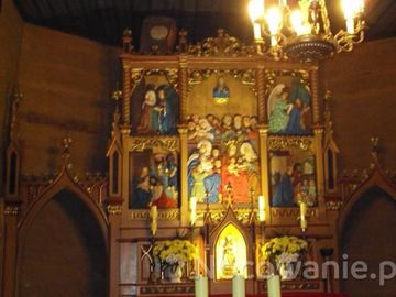 ołtarz główny w starym kościółku - nastawę stanowi tryptyk - przedstawia w polu środkowym "Wielką Świętą Rodzinę", tam u góry Bóg Ojciec a niżej za wyrzeźbioną (Olesno)