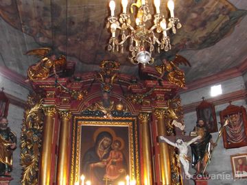 ołtarz główny z obrazem Matki Boskiej z Dzieciątkiem podającym jabłko Maryi, nad prezbiterium polichromia iluzjonistyczna - czterolistny medalion z chmurami, promieniami oraz Okiem Opatrzności w otoczeniu aniołków.