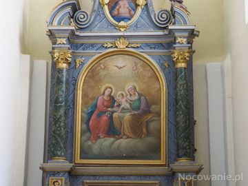 ołtarz w kaplicy - po prawej, obraz przedstawia ikonograficzne ujęcie postaci biblijnych, kolumny pozornie oplatane ornamentem wici roślinnej.