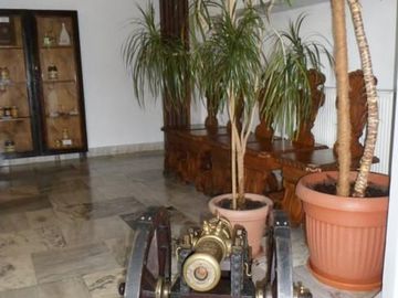 pałac Reyów miał niegdyś charakter obronny, stąd też potocznie nazywany był zamkiem, powstał w toku kilku faz przekształcenia dworu obronnego - tu w holu w miniaturze działo oblężnicze.