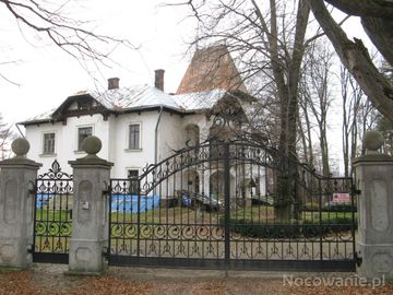 pałac, XIXw. - na rzucie litery L, przy fasadzie wieża i loggia, brama główna - wyposażona współcześnie, ogrodzenie pełne.
