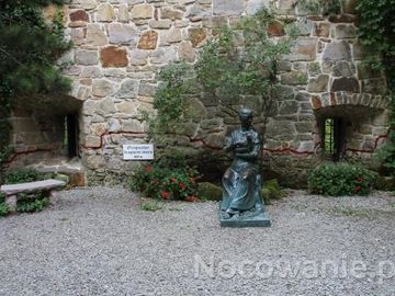 pani na zamku - tuli pieska, może na bramę zamkową spogląda i powrotu męża oczekuje bo napastników pogonił - opryszków, co na szlaku handlowym kupców napadali ? - zastanawia też "ta krecha" u podnóża baszty fortecznej - straży zamkowej trzeba by zgłosić, zakomunikować...Dowiadujemy się też, że Pani na zamku to dama z łasiczką wyrzeźbiona przez Karola Badynę.