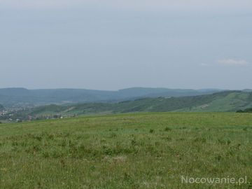 pastwiska na wierzchowinie, na prawo fragment zbocza g. Chełmiec, w dali Łazy Stróżowskie i zejście wąwozem - zakrzaczonym po jednej stronie przez tarniny do wsi Prusiek, której zabudowania od strony wsi Sanoczek - na zdjęciu widać.