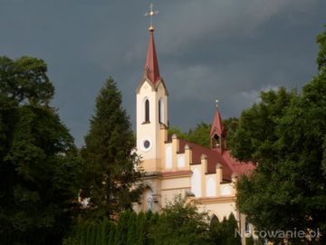 piękna i wyrazista prezentacja bryły i wież kościoła na tle nieba - tuż przed burzą. (Rymanów-Zdrój)