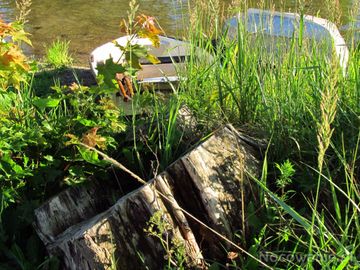 Pień drzewa i łódki na brzegu kanału Wdy przy ujściu z jeziora Wdzydze (Borsk)