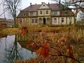 Piętrowy dwór, z lekko zryzalitowaną częścią środkową poprzedzoną drewnianym gankiem, nakryty – tak jak ryzalit – bardzo płaskim dachem dwuspadowym wzniesiony z  (Ostrobudki)