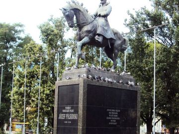 Plac Litewski. Pomnik marszałka Piłsudskiego i towarzyszące mu gołębie.