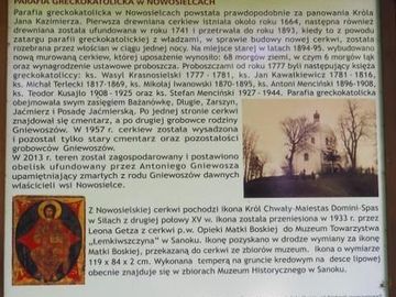plansza - przy wejściu na wzgórze cerkiewne, prezentuje wiele informacji dot. wsi, okolic, cerkwi i rodu Gniewoszów - niegdyś miejscowych właścicieli dóbr ziems (Nowosielce)