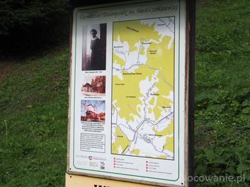 plansza przy szlaku im. Marii Czerkawskiej - ur. w 1881r., poetka, nowelistka, autorka książek dla dzieci. Wydała zbiór nowel "Z listów do niego" - 1912, tom wierszy patriotycznych "Poezje z 1914-15 roku", "Zielony cień" - 1928, "Sieci na wietrze" - 1931,"Ludzie i liście" - 1935,"Malowanka na szkle" - 1939, "Jałowcowe żniwa".Zmarła w 1973r. - pochowana w Krakowie na cmentarzu na Salwatorze.