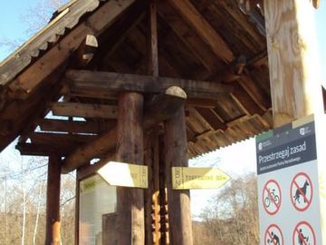 plansza tematyczna - w ładnej, stylowej ramie, starannie wykonanej, przed wejściem na torfowiska. (Tarnawa Niżna)