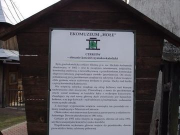 plansza z informacjami o świątyni, tam też o tym że po 1951r. tj. po wysiedleniach ludności a przed zasiedleniem ludnością napływową cerkiew służyła jako magazyn - inne źródła podają, iż chodzi o magazyn węgla drzewnego, tu w Bieszczadach wypalanego w mielerzach - kopcach ziemnych - piramidach darniowych a później - dużo później - w retortach, polecam galerię m. Polanki.