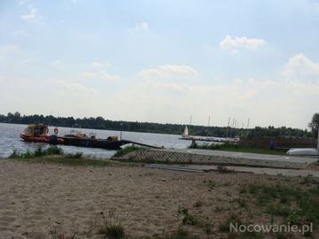 Plaża przy hotelu "500" w Zegrzu Południowym - lądowisko helikopterów i pomost, przy którym cumują motorówki ratowników (30.07.2009) (Zegrze Południowe)