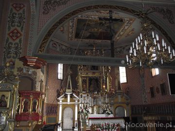po lewej: ambona z 1717r. barokowa z malowidłami ewangelistów na parapecie. Pod prezbiterium kościoła w krypcie grobowej pochowany Zyndram z Maszkowic, rycerz, (Humniska)