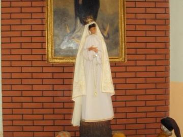 po wejściu do hollu Muzeum Sanktuaryjnego prezentowana jest scena Objawień Fatimskich - troje pastuszków i ukazująca im się Matka Boska.