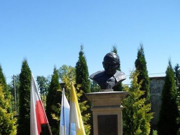 pomnik - popiersie papieża Jana Pawła II - przy kościele pw. Wniebowzięcia NMP w parafii św. Zygmunta w Opinogórze Górnej. (Opinogóra Górna)