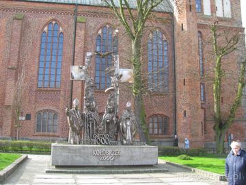 Pomnik przedstawia Bolesława Chrobrego i Ottonalll w roku 1000 oraz Jana Pawła ll i Benedykta XVl