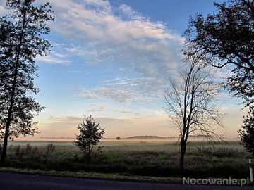 Poranna, jesienna mgła nad łąkami przy krajówce 22