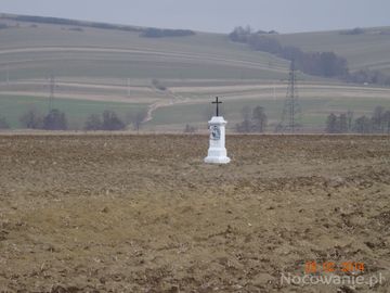 postument z krzyżem i małej wnęce 30 cm/wys. figurka Matki Boskiej, to na pocz. XX w. Różelewicz wystawił, bo tam syn jego zginął od rażenia piorunem. W obniżeniu terenu w zakrzaczeniu potok Czernisławka - pełny uroku jego przełom we wsi Odrzechowa - a dalej za potokiem po lewej zbocze wzgórza Patria - 474m npm.