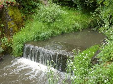 Potok Płowiecki - n/z próg widoczny z mostu na ul. Konarskiego.