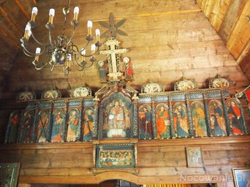 powyżej, na boazerii sklepienia, w środku : Grupa Ukrzyżowania - Matka Boża, Chrystus na krzyżu, Archanioł Gabriel (?) adorujący. poniżej Rząd Apostołów - Deesi (Kotań)