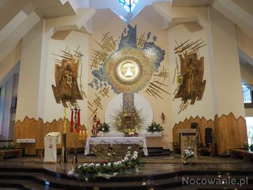 prezbiterium kościoła : w części centralnej ołtarz główny podniesionego do rangi Sanktuarium Dzieciątka Jezus.