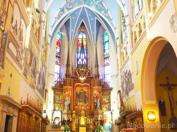 prezbiterium z ołtarzem - tam obraz z patronem kościoła, wszystko pięknie odrestaurowane, sklepienia sufitowe w kolorze biblijnego nieba - no ale jesteśmy w sanktuarium św. Stanisława ze Szczepanowa - to jest ranga i to jest dostojność !