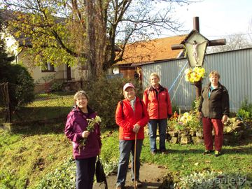 przed / obok: krzyż przydrożny w medalionie przedstawienie Chrystusa Ukrzyżowanego, otoczenie ukwiecone, zadbane, otoczone pozornym murkiem z surowego kamienia - przy drodze na Glinice.