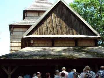 przed: babińcem cerkiewnym, najstarszą drewnianą cerkwią w Polsce, cerkiew pw. św. Paraskewy.