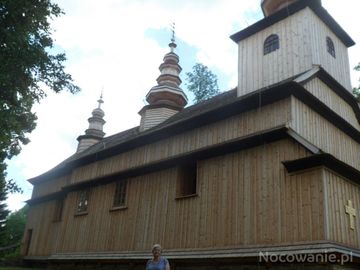 przed cerkwią - po prawej przy murze jest tablica ogłoszeń i tam podany nr tel. pod którym można prosić o klucze do cerkwi, tam mi.in. na parapecie chóru polichromia ze sceną przedstawiającą kobiety idące do cerkwi - tej cerkwi oraz inna scena : łemko siejący zboże.
