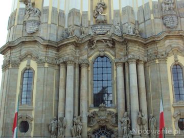 przed fasadą kościoła : Sanktuarium Matki Bożej Łaskawej. W galerii : Opactwo Cystersów, założone w XIII w. a tu : z kościołem stanowiącym jeden z zabytków najc (Krzeszów)
