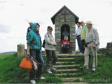 przed kapliczką św. Tekli - czczonej pierwszej męczennicy chrześcijańskiej, w liturgii religii prawosławnej : Równej Apostołom, często przedstawianej z płonąc (Wola Sękowa)