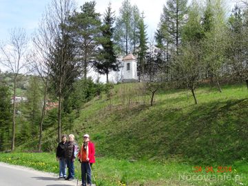 przed kapliczką z rzeźbą św. Nepomucena /Nepomuka - tak czasem zwanego/, patrona mostów i nietykalności oczyszczonego sumienia - inaczej : patrona od dobrej sławy - albowiem wolał wybrać śmierć aniżeli zdradzić grzechy królowej. Figury tego świętego często z palcem położonym na ustach:"Trzymaj je zamknięte" i w pobliżu dworów: "Nawet o złym panu nie należy źle mówić".