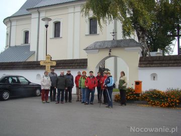 przed: kościół parafialny z 1757r. z oddzielnie stojącą dzwonnicą, otoczony obronnym murem z widocznymi otworami strzelniczymi, w ściętych narożnikach - bramki.