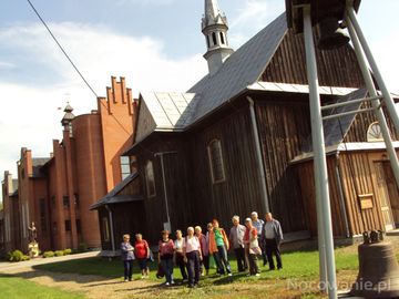 przed kościołami : nowym i starszym, drewnianym budowanym w latach 30-tych XX wieku, modrzewiowym, zabytkowym - współcześnie służącym jako kaplica przedpogrzebowa - z nami ksiądz senior Bukowiński, były proboszcz tutejszej parafii.