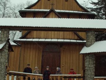 przed kościołem ale już za bramą - poczekamy na p.Rafała - kościelnego, obiecał kościół nam otworzyć i poopowiadać o dziejach, o rycerzu Zyndramie, o pracach w (Humniska)