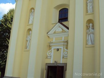 Przed kościołem pw. św. Mikołaja z 1 poł. XVIIIw. W fasadzie posiada dwie wieże, w niszach tych wież cztery rzeźby z XIXw. - dwóch św.św. biskupów oraz św.św. Piotrem i Pawłem, nad gł. wejściem "Oko Opatrzności".