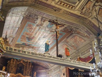 przed prezbiterium : belka tęczowa, na niej grupa Pasji z XIXw., krucyfiks i rzeźby Matki Bożej Bolesnej i św. Jana Ewangelisty. (Iwonicz)