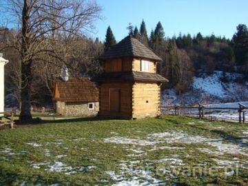 przy cerkwi: kaplica grobowa, dzwonnica. Po prawej: myhliłka /fragment/ - tj. polana, gdzie kiedyś owce i woły wypasano /żerdzie odgradzają zespół cerkiewny/, tam też majdan odpustowy, jarmarczny - namawiam do lektury: "Mąż szalony" - Zygmunt Kaczkowski /zapraszam do galerii: Bereżnica Wyżna, Zagórz/.