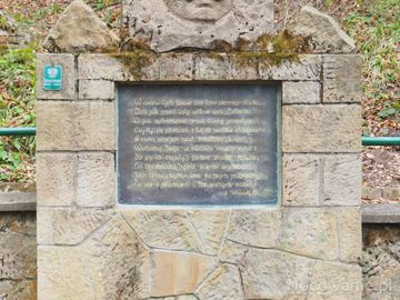 przy pomniku przyrody : "źródło Bełkotka", sławiona przez poetów, tam też na postumencie : płaskorzeźba głowy Wincentego Pola, twórcą był Władysław Kandefer, r (Iwonicz Zdrój)
